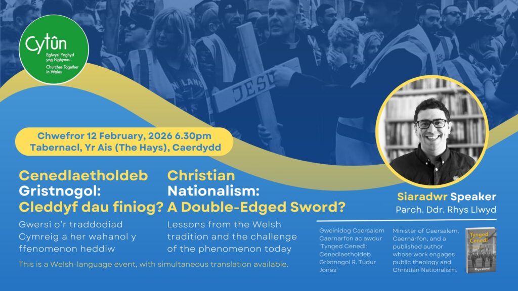 Caerdydd, Ionawr 2026 – Mae Cytûn yn cynnal trafodaeth amserol ar genedlaetholdeb Cristnogol ddydd Iau 12 Chwefror 2026 am 6.30yh, gan archwilio’r ffenomen fyd-eang a’i pherthynas â thraddodiad Cristnogol Cymru.